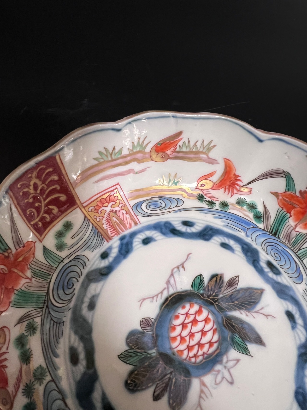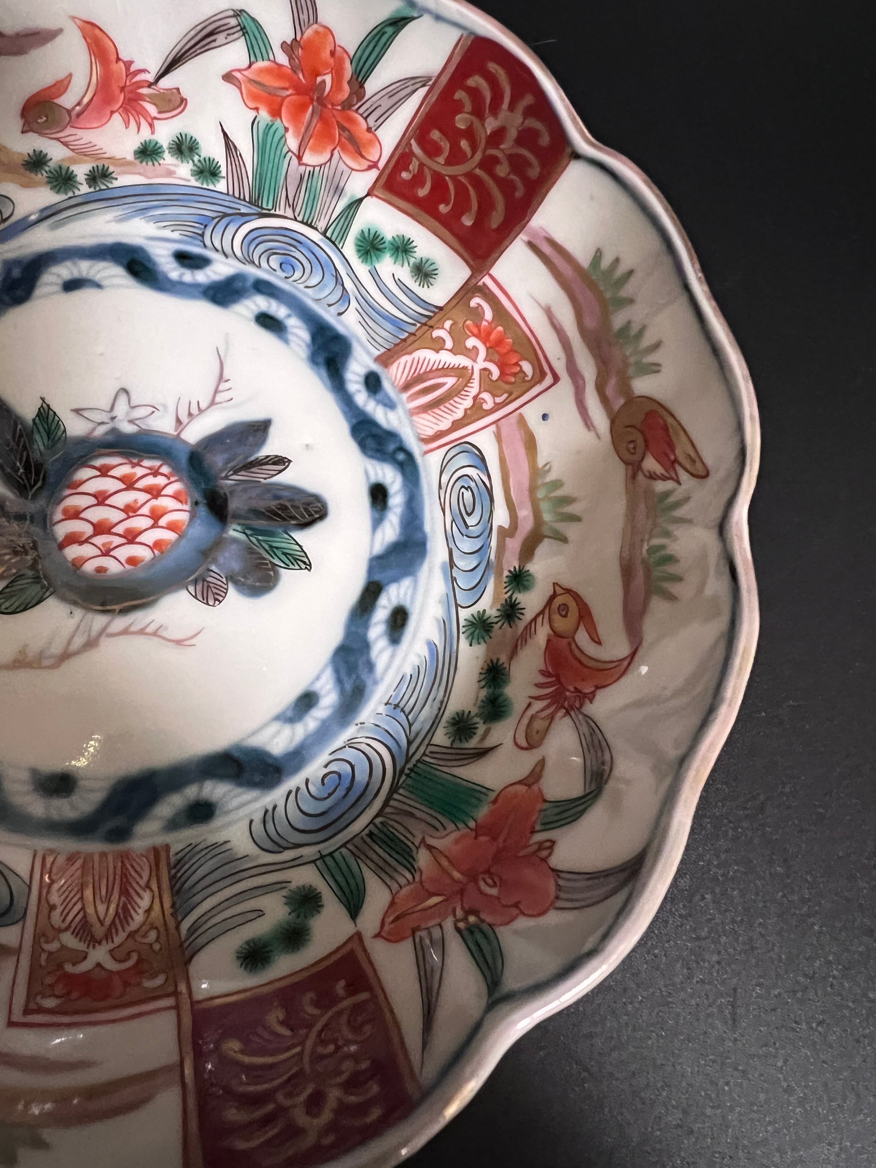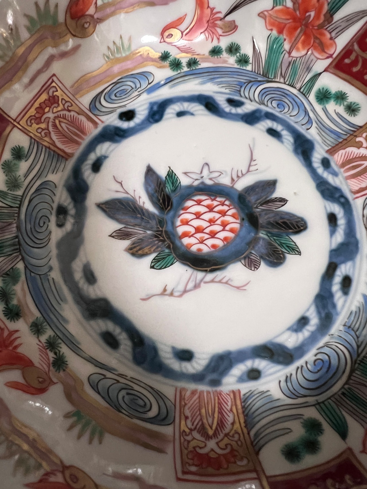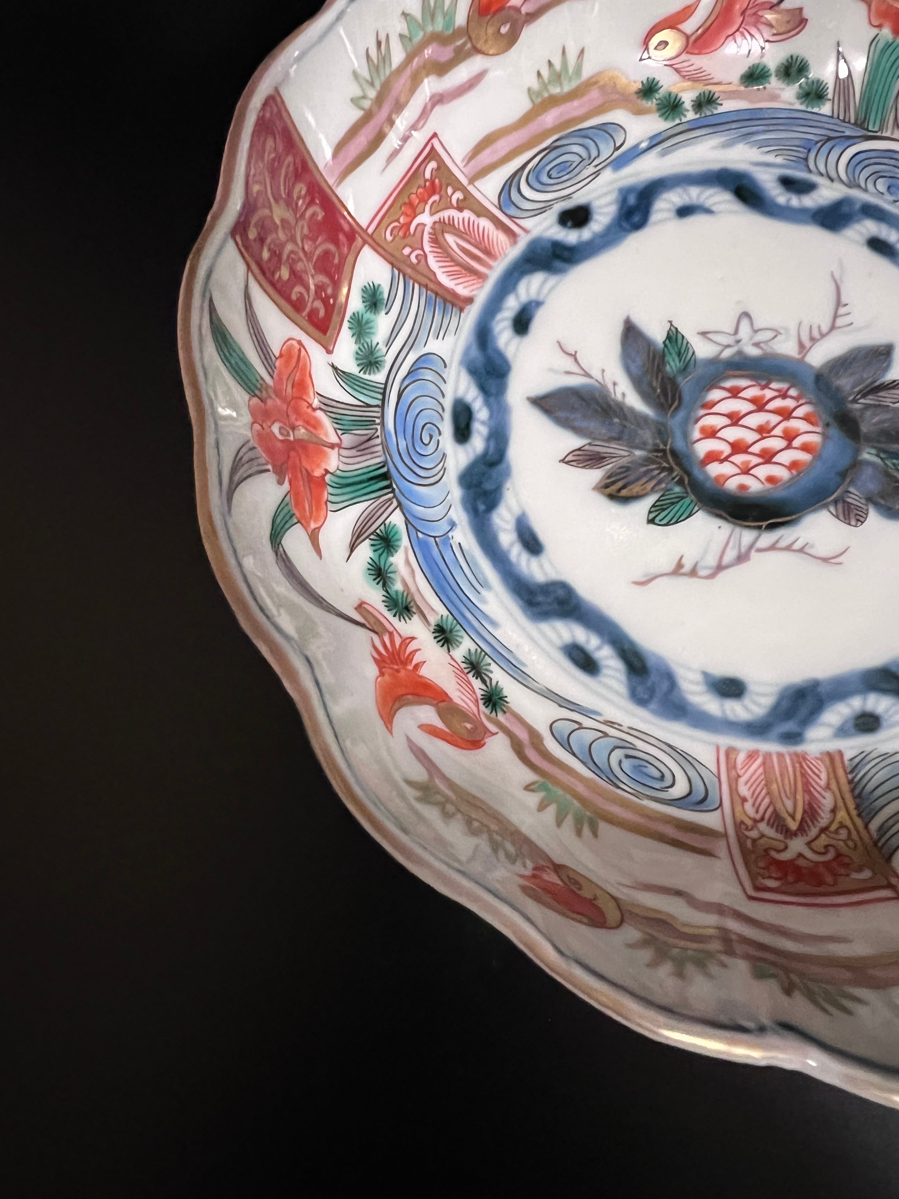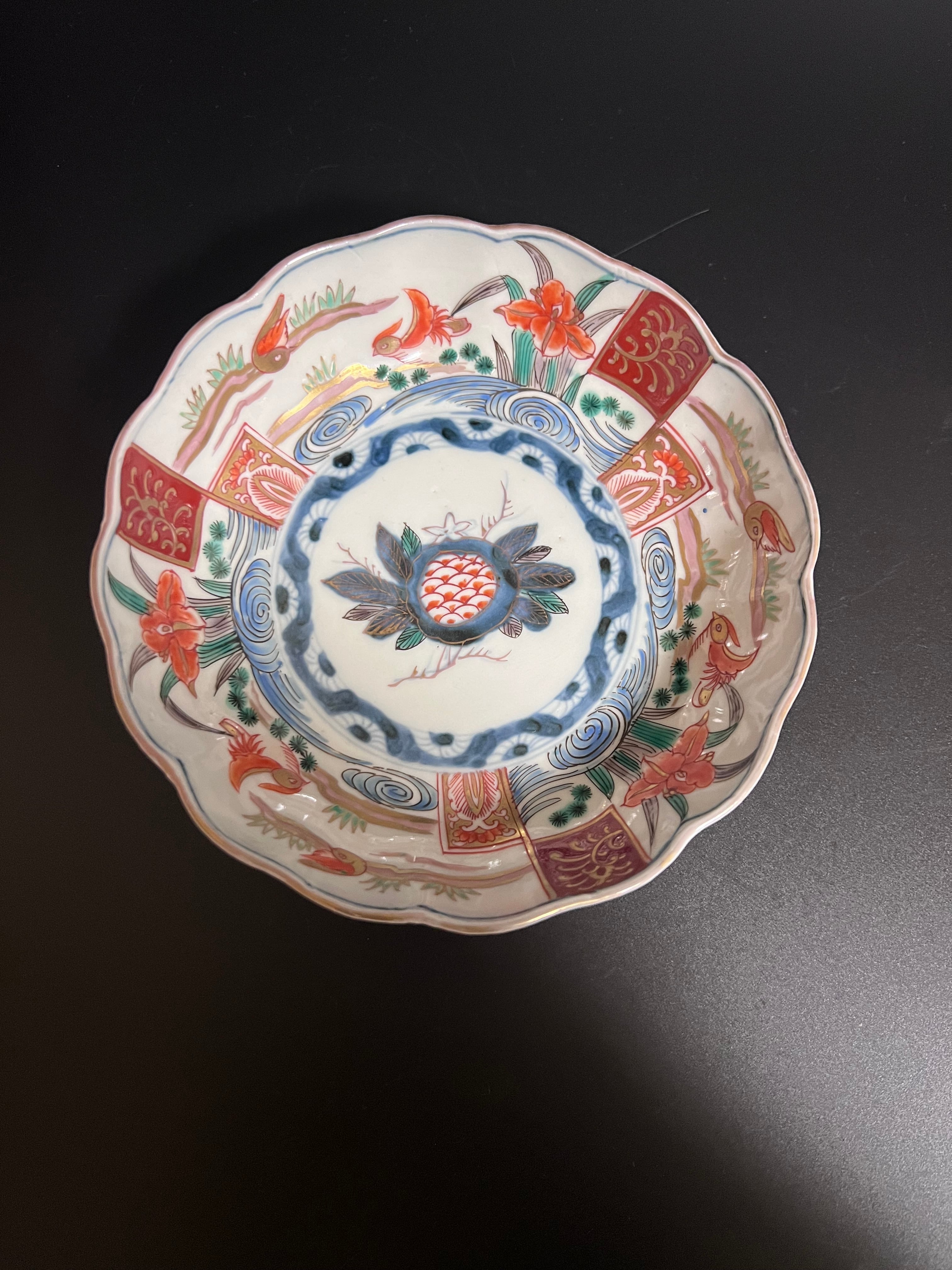 柘榴と鴛鴦(おしどり)が描かれた色絵のなます皿です。