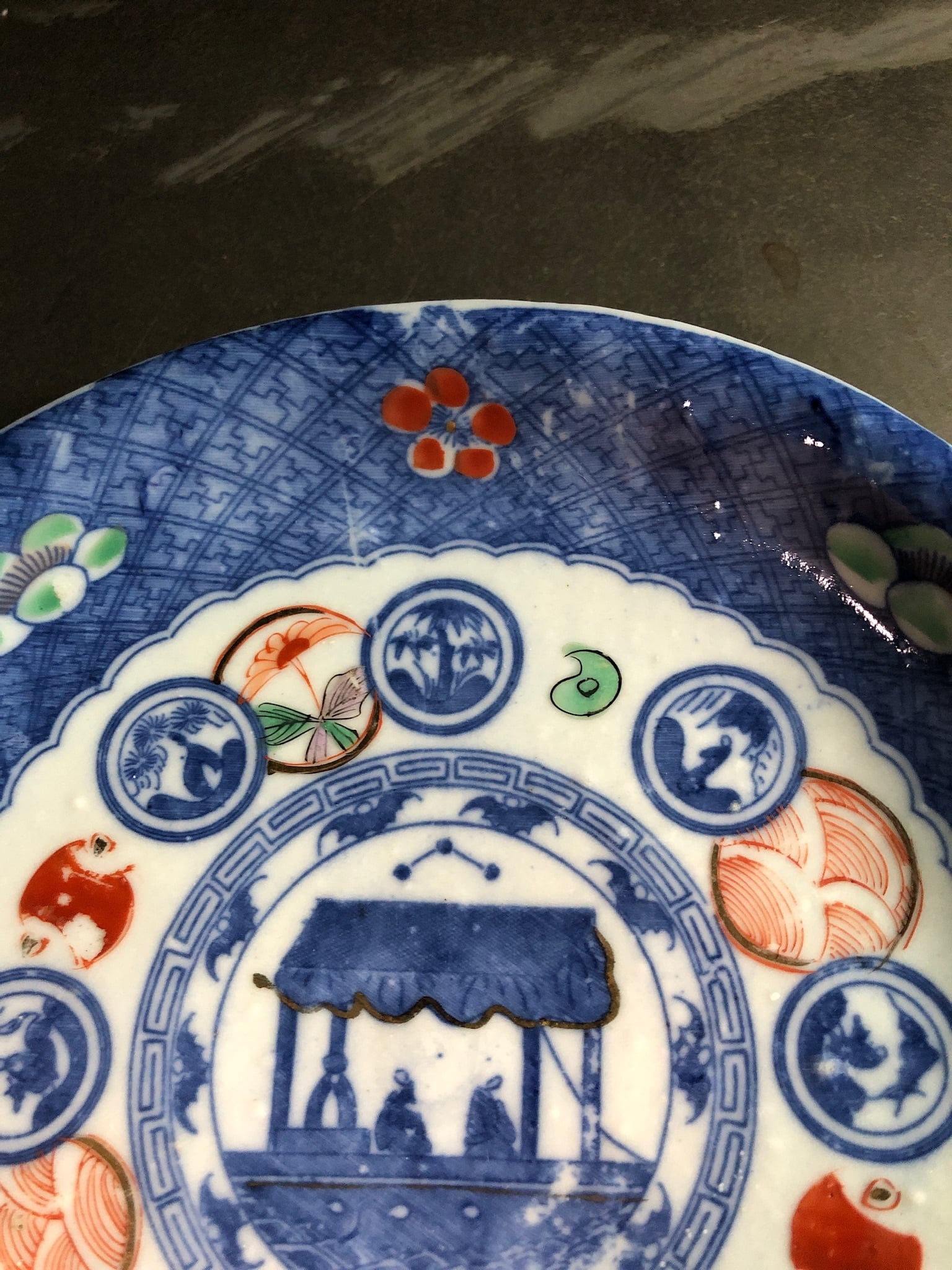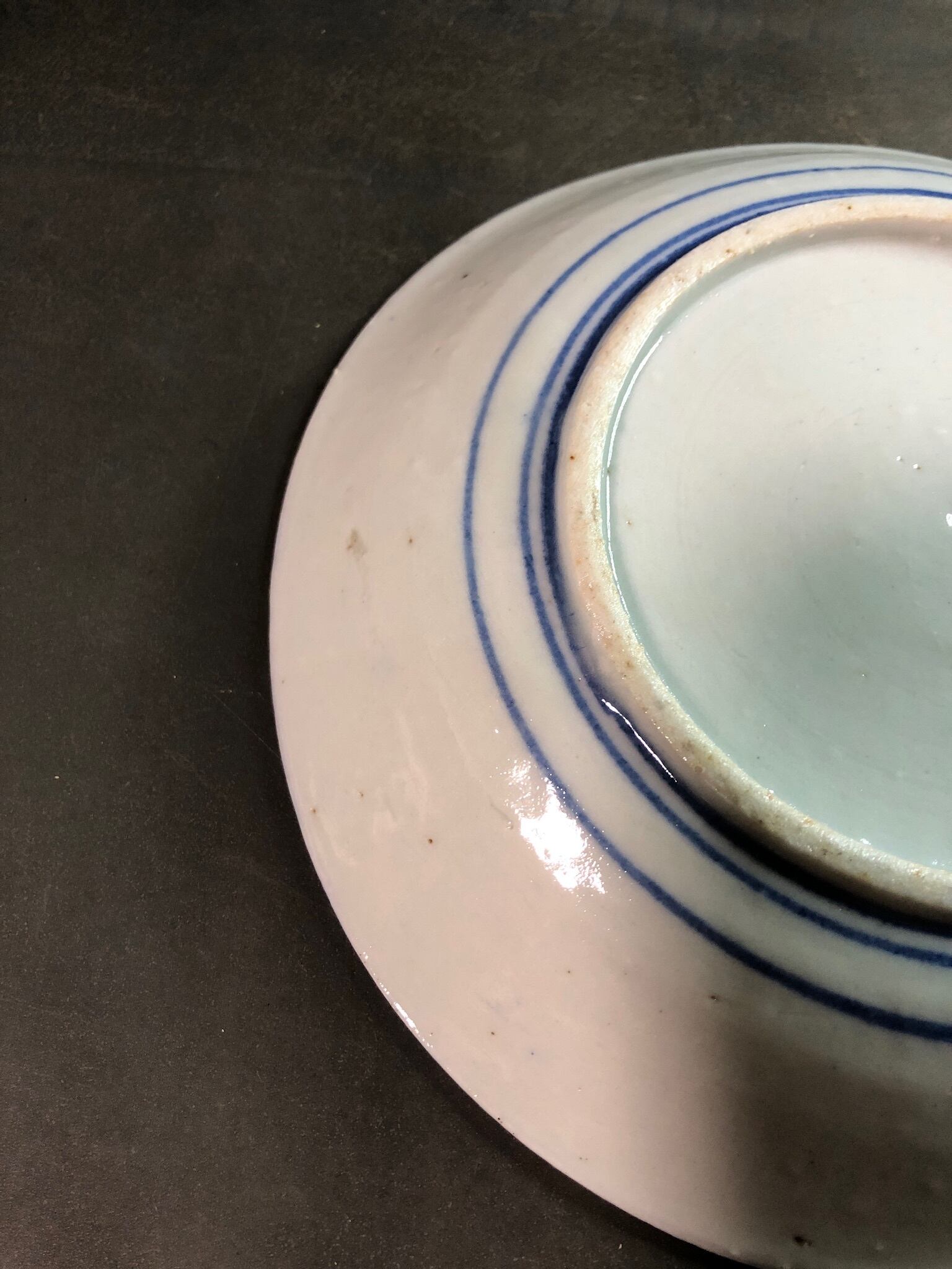 中央には船、その周りに蝙蝠、そして窓絵、梅と細かな文様と、とても美しい印判中皿です。