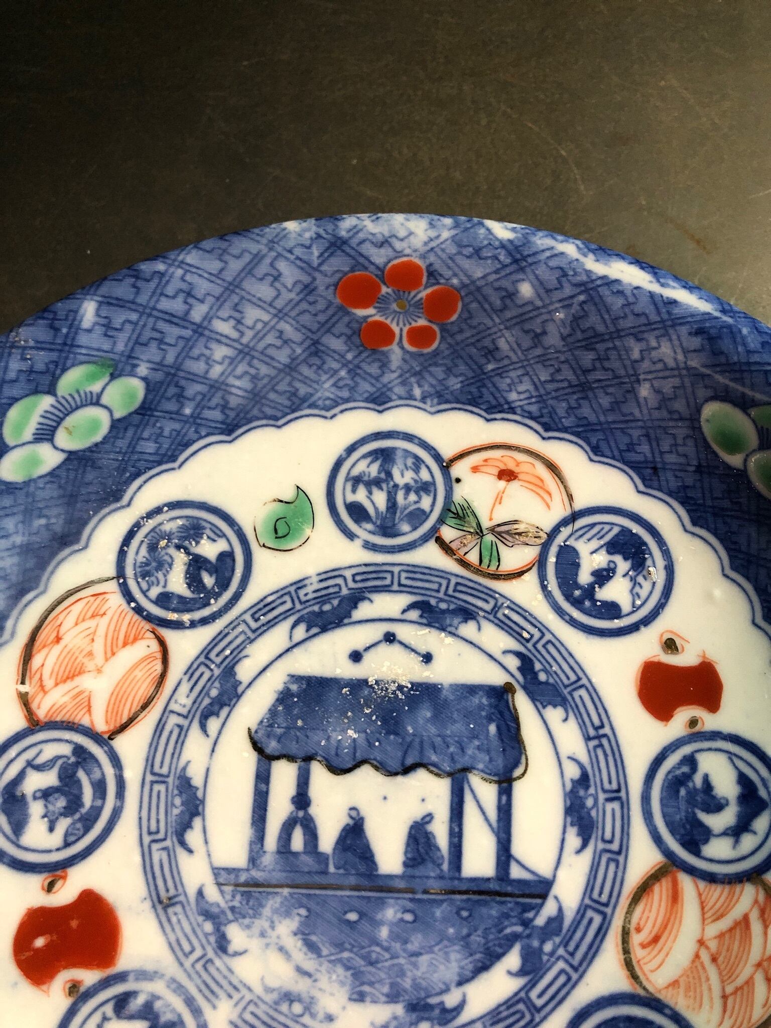 中央には船、その周りに蝙蝠、そして窓絵、梅と細かな文様と、とても美しい印判中皿です。