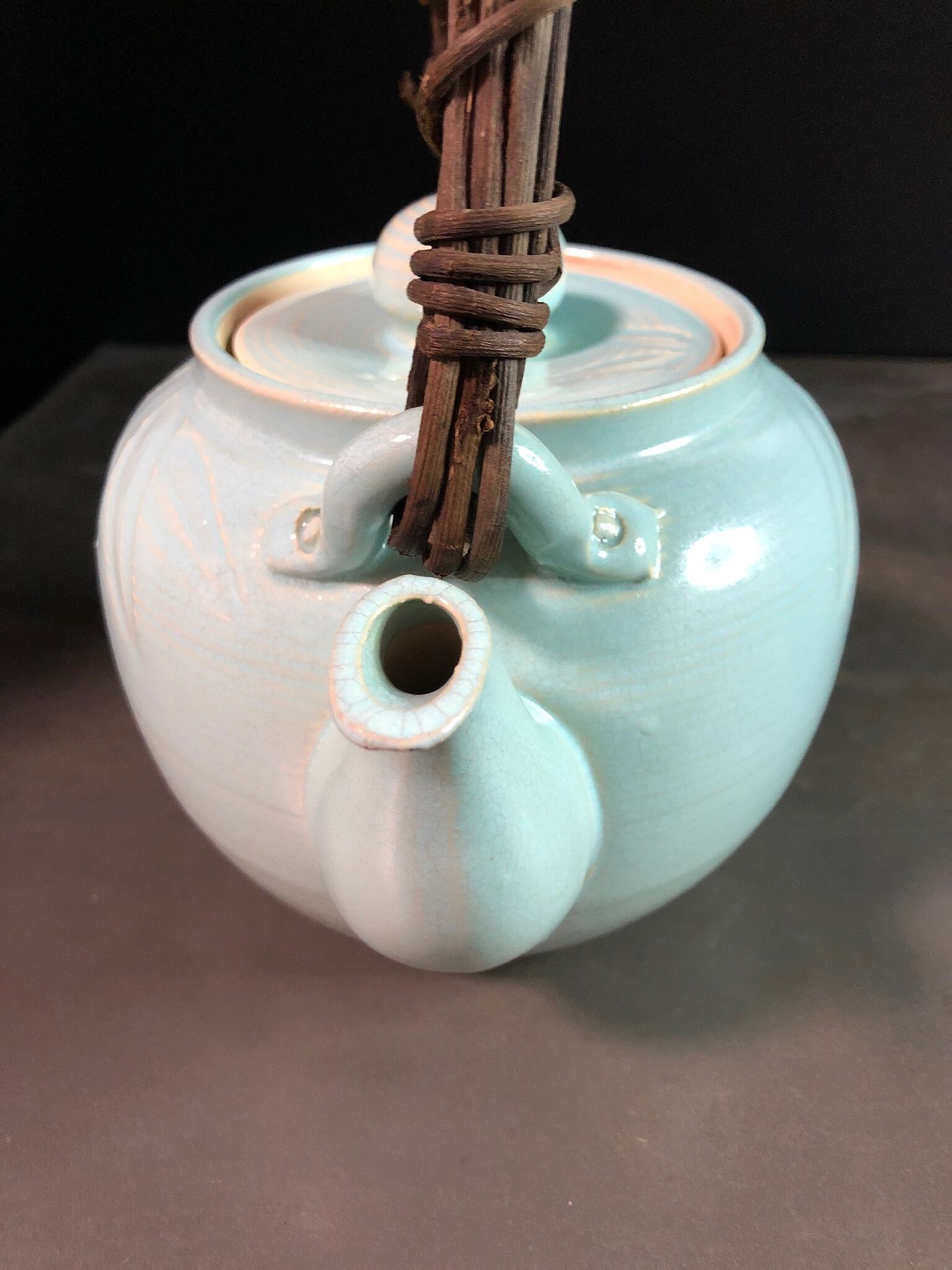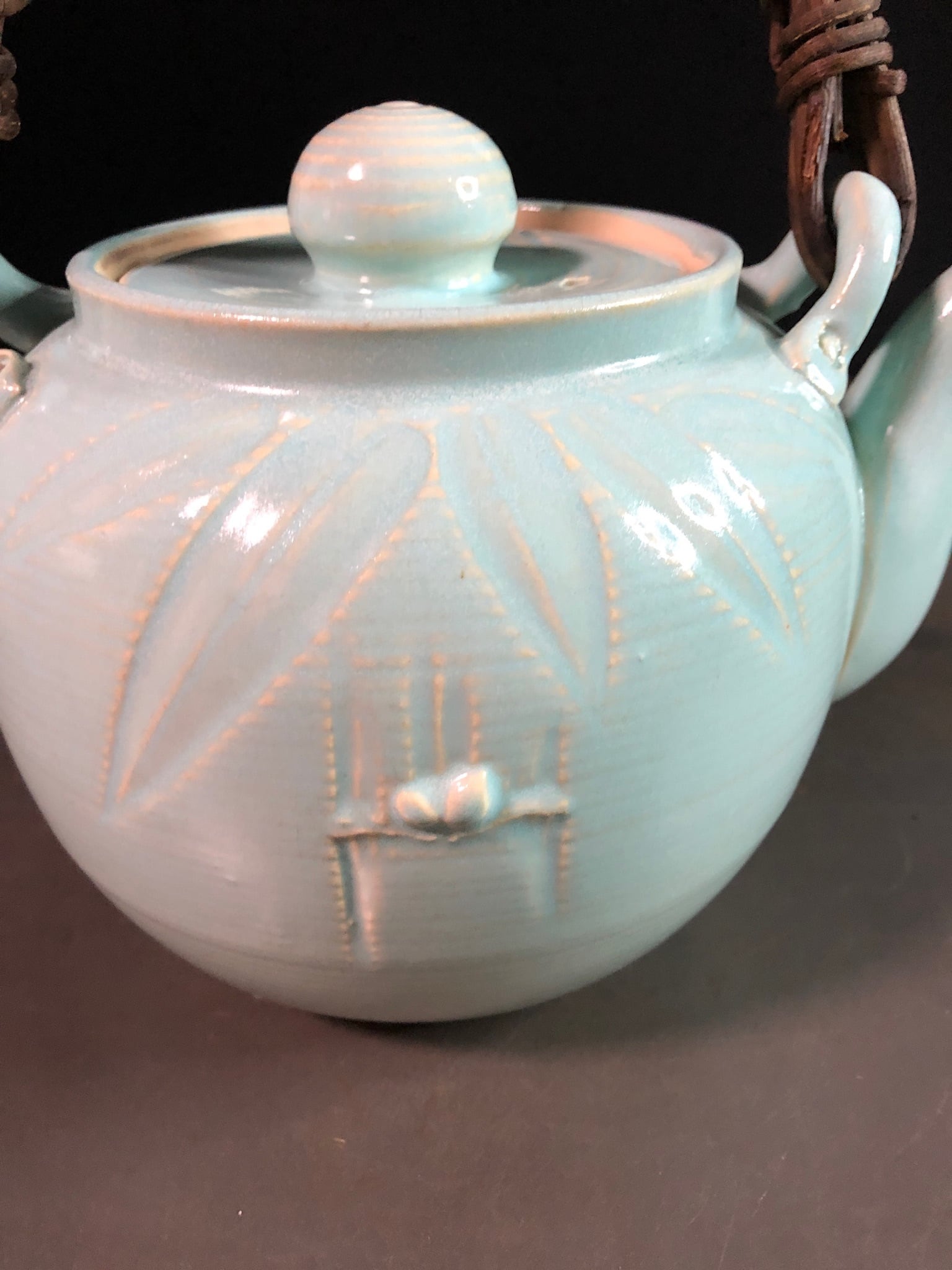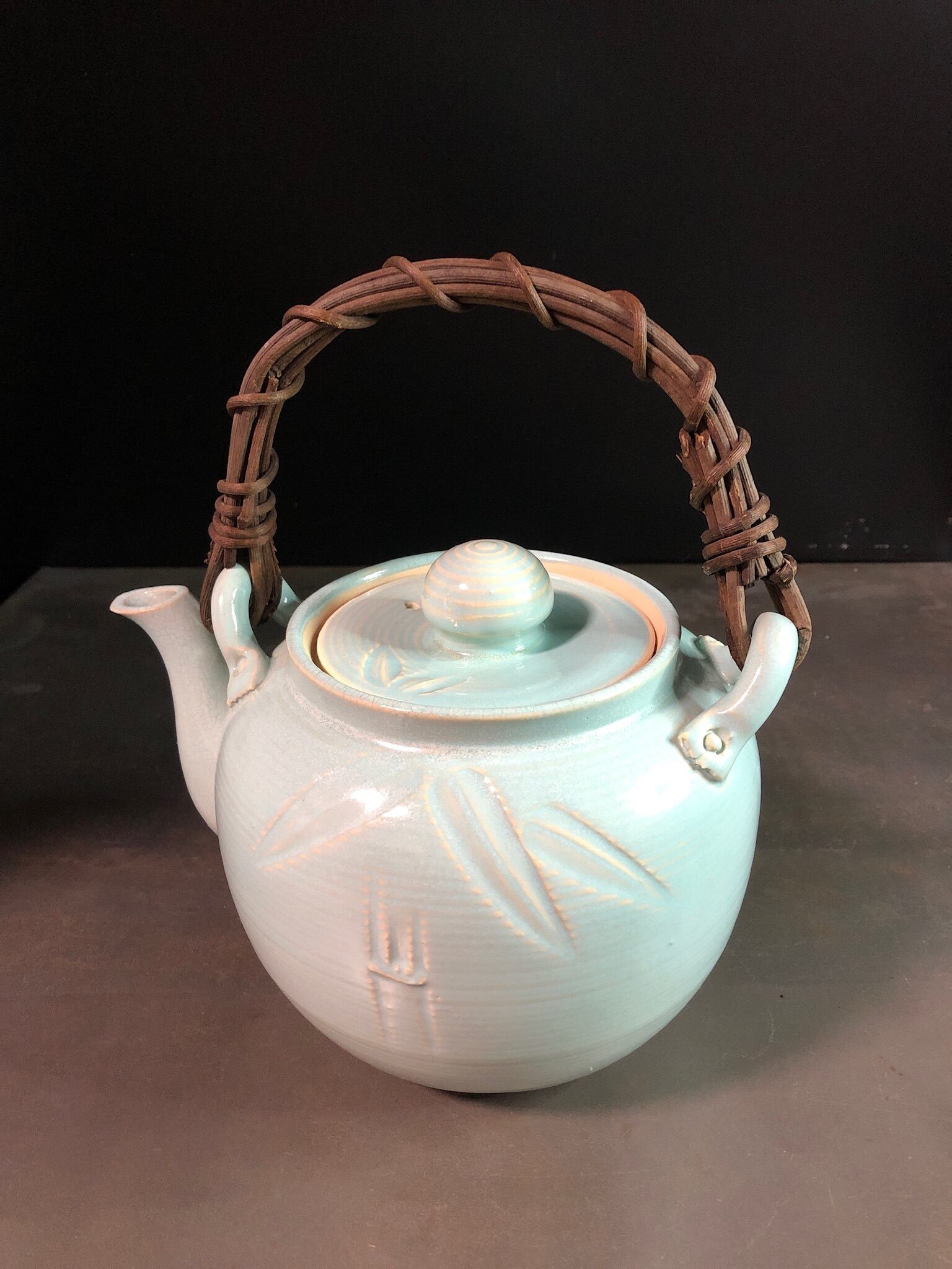 淡く美しい水色に竹が型押しされた、丸いフォルムが可愛い土瓶です。