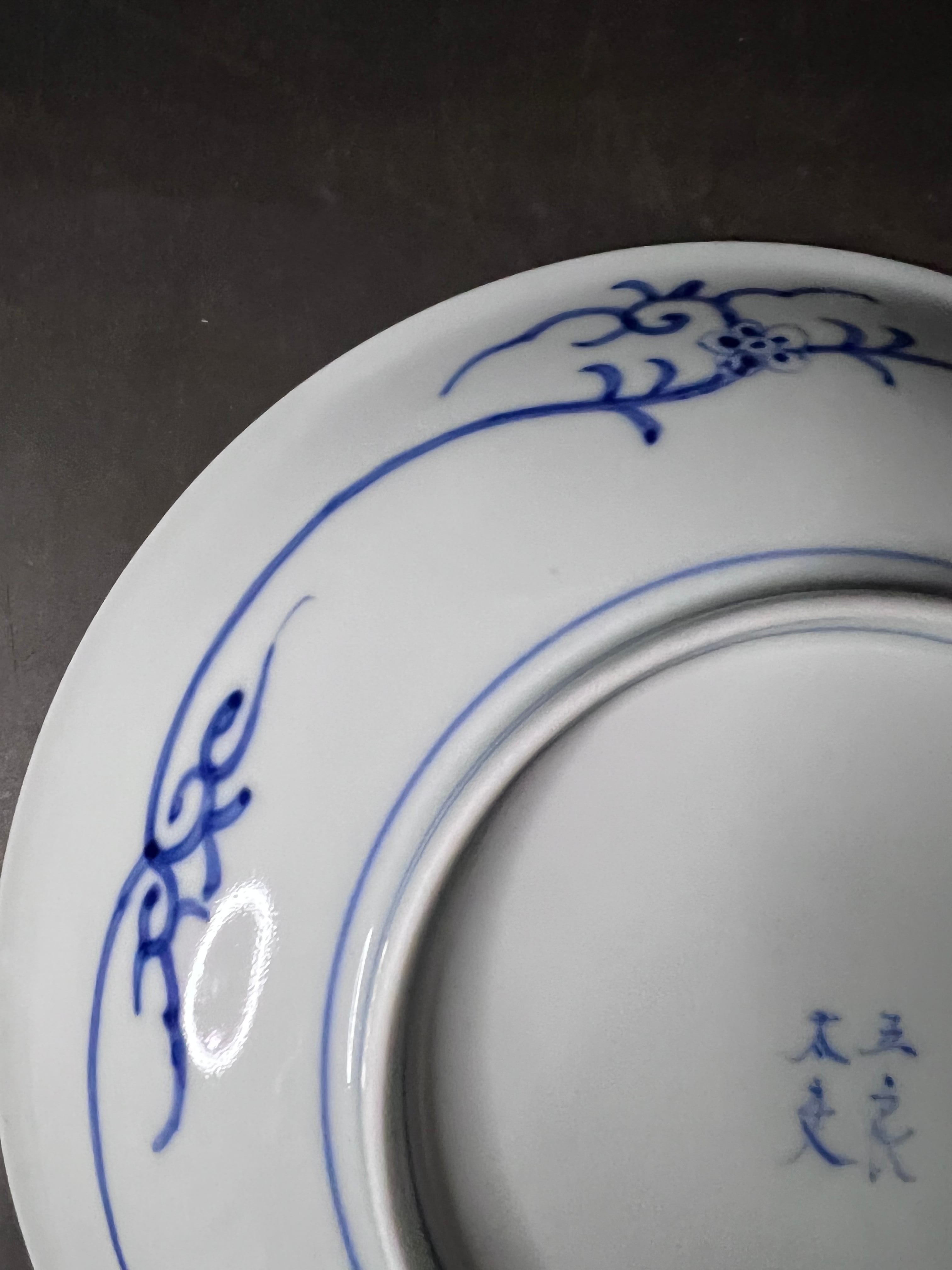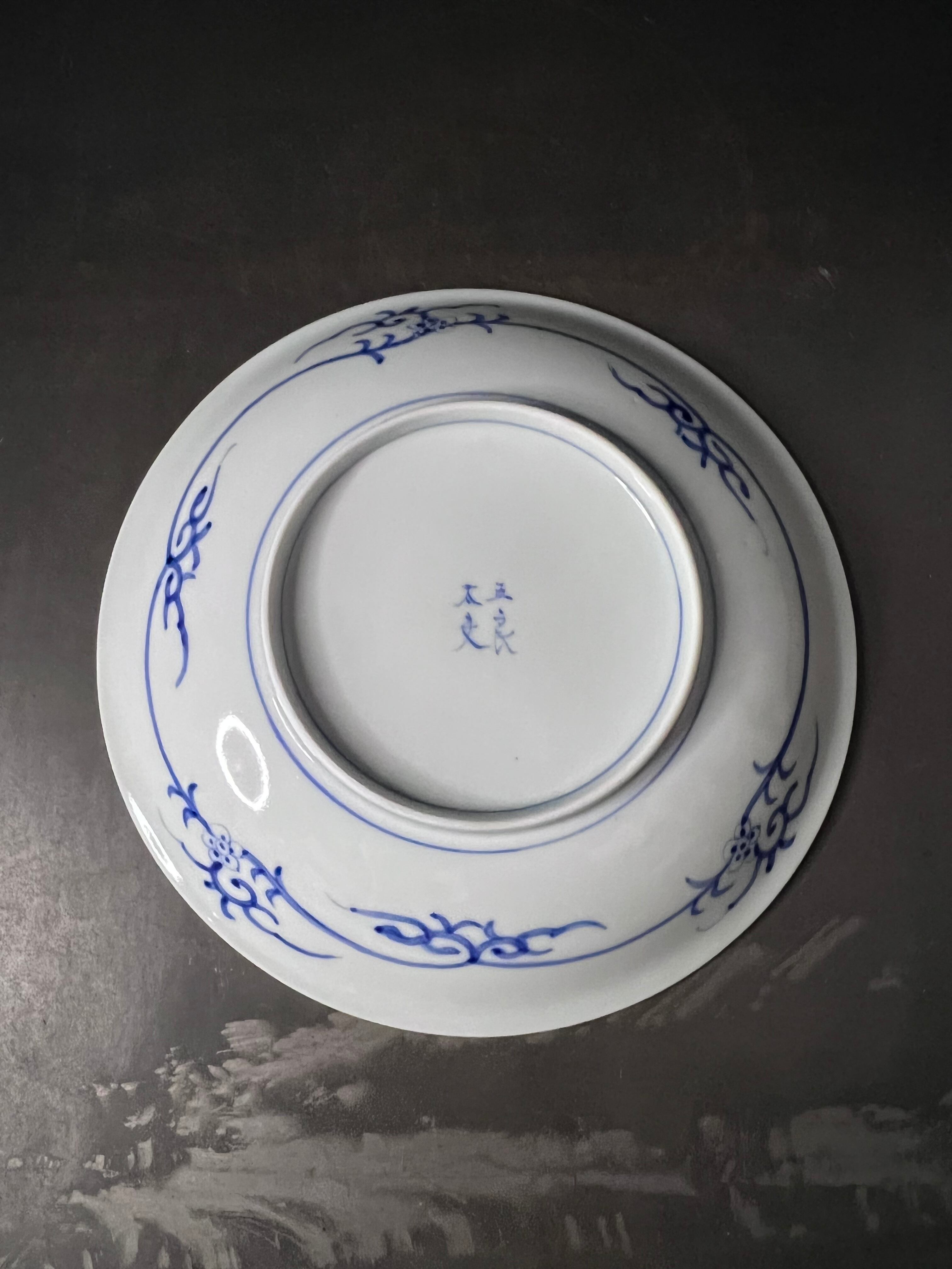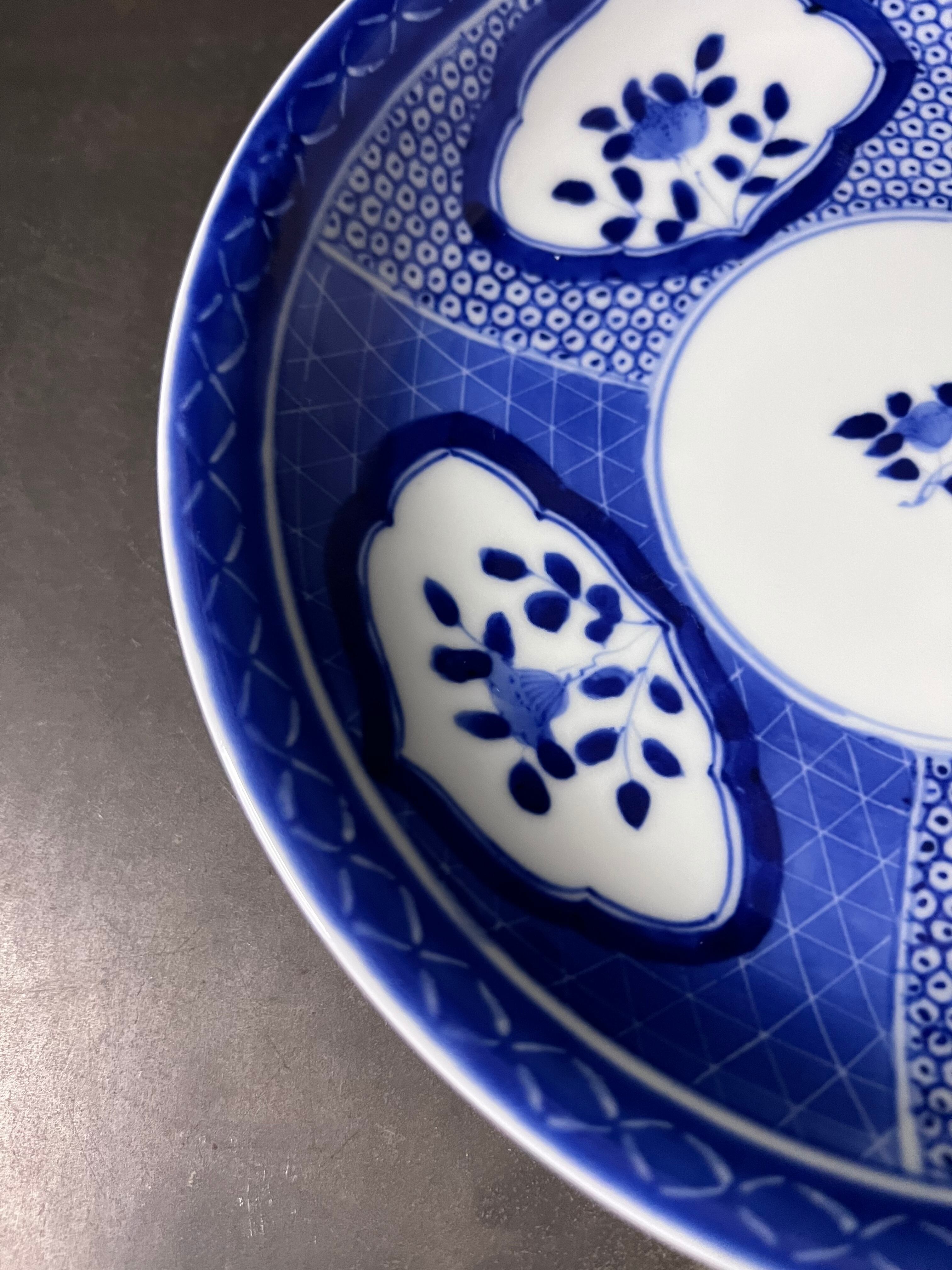 窓絵のなかに草花が描かれた、細かな絵付けが美しい染付中皿です。