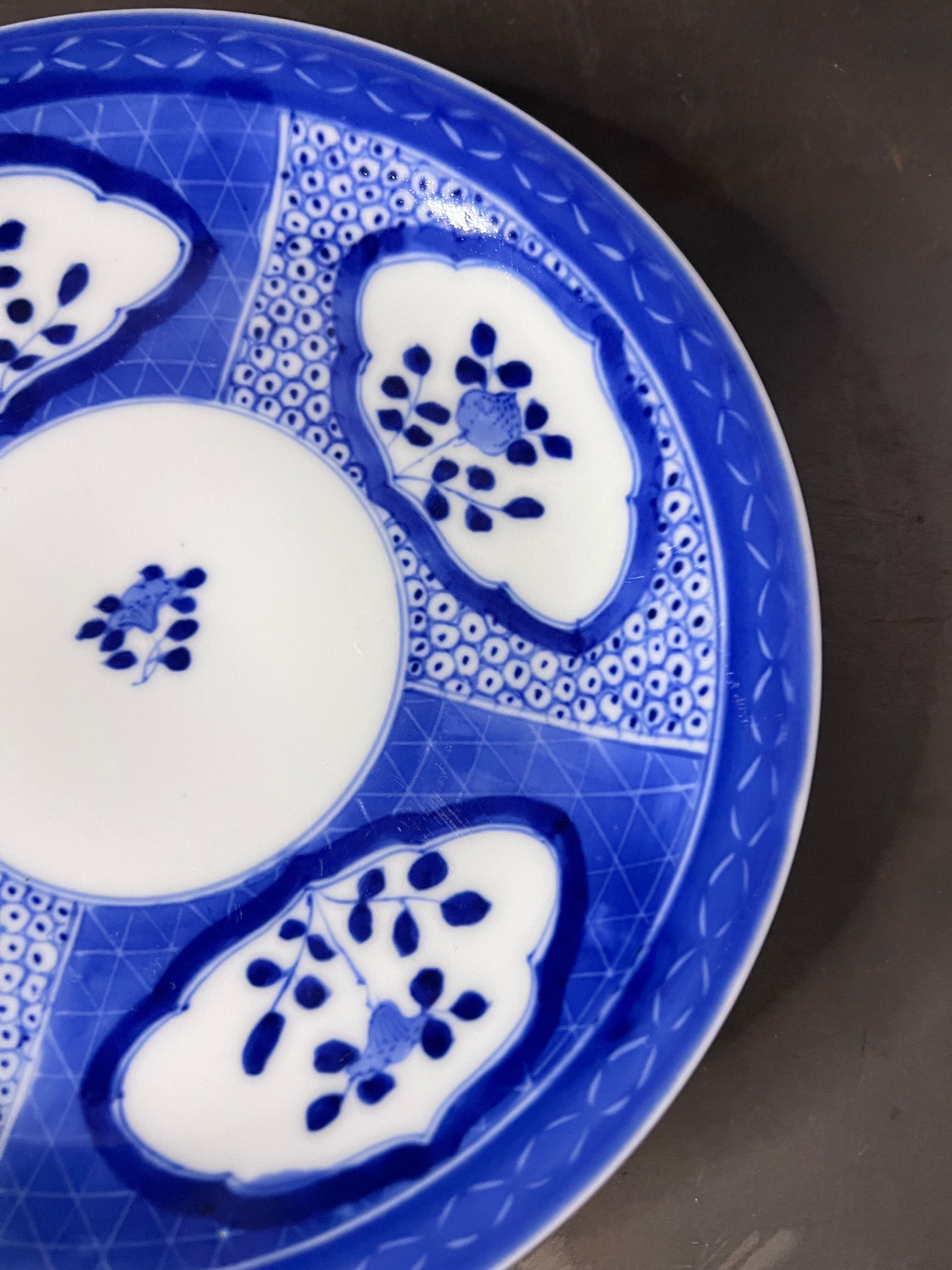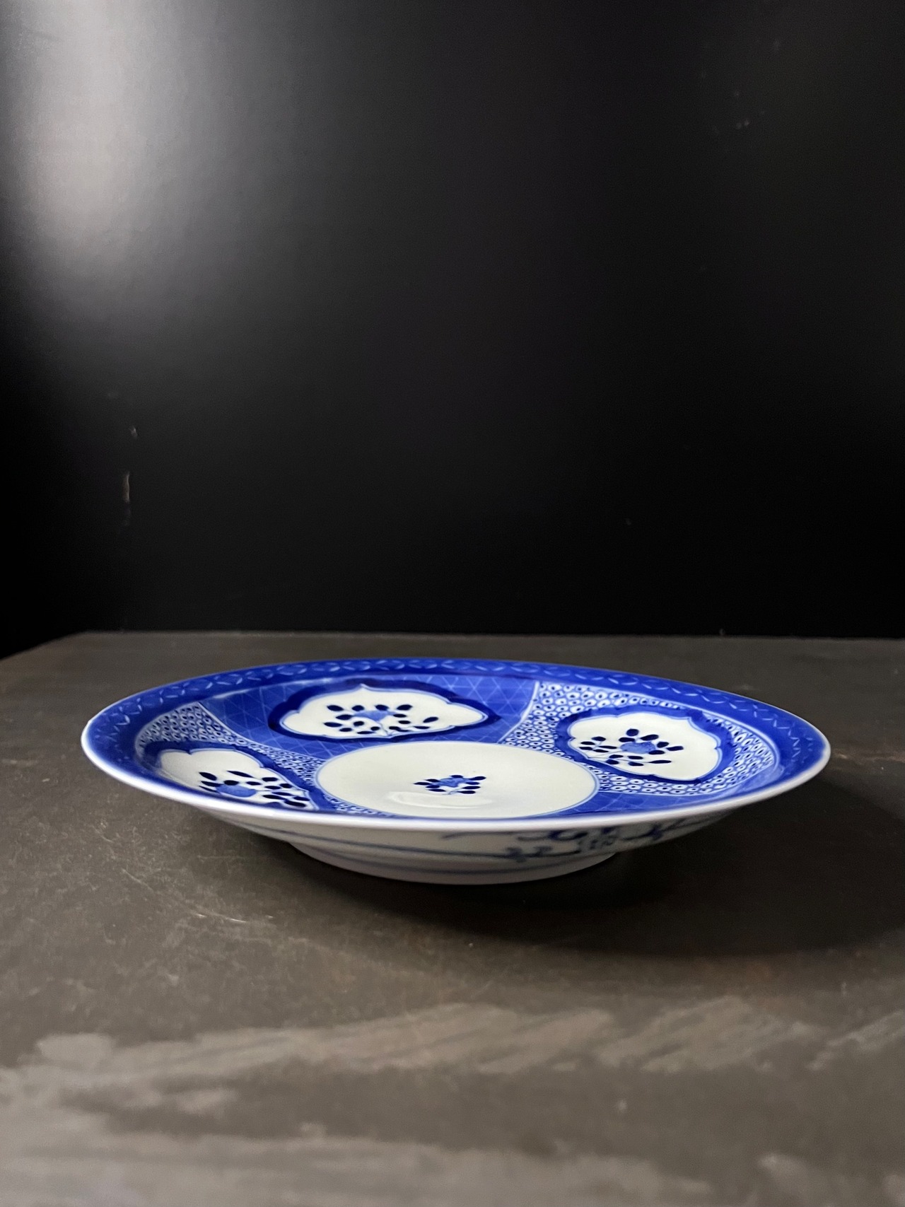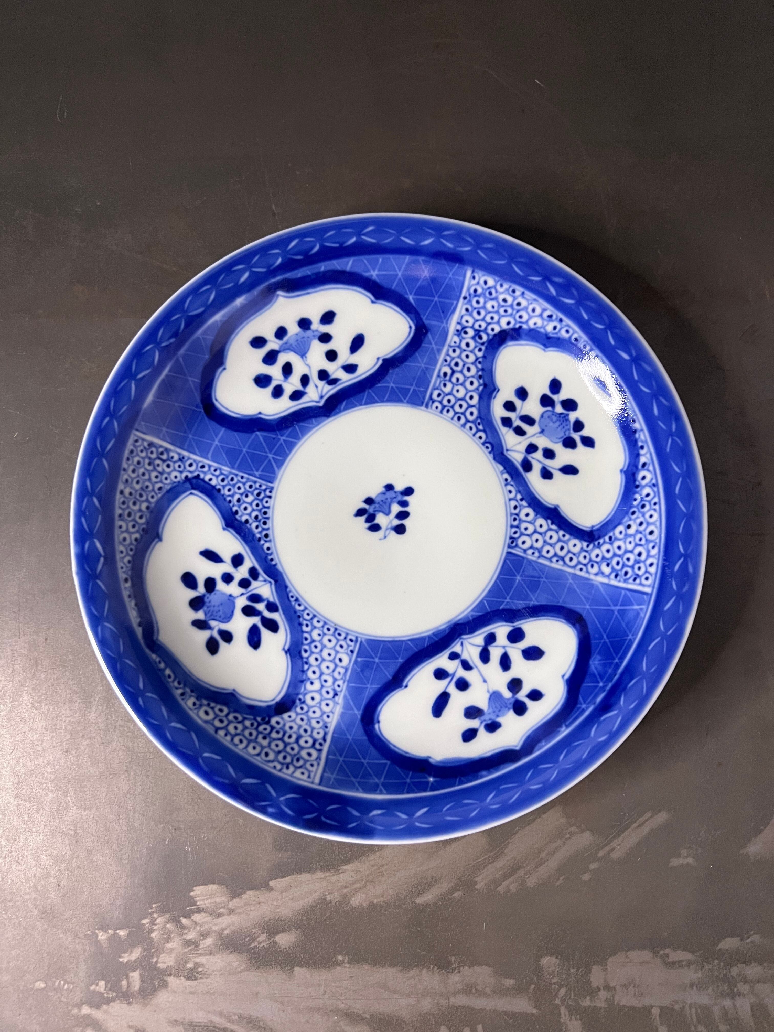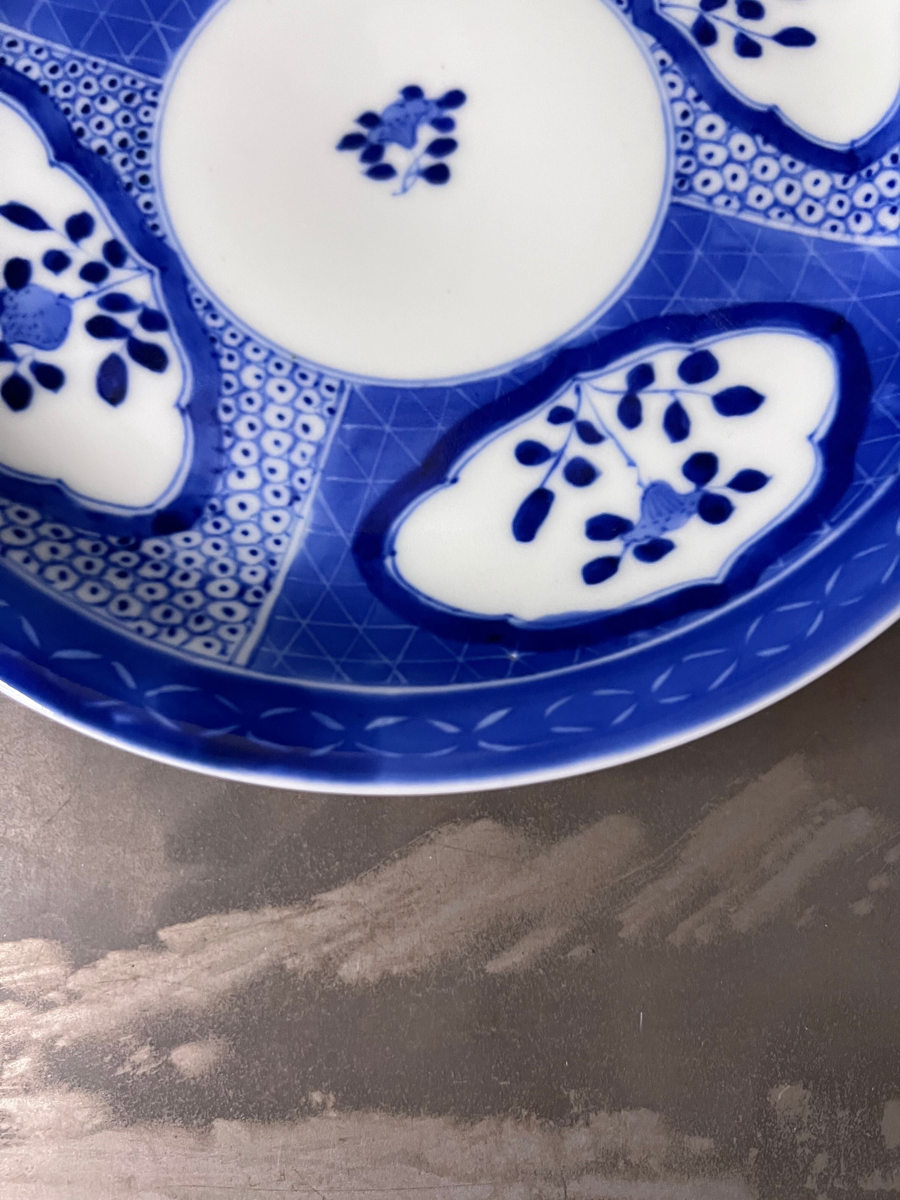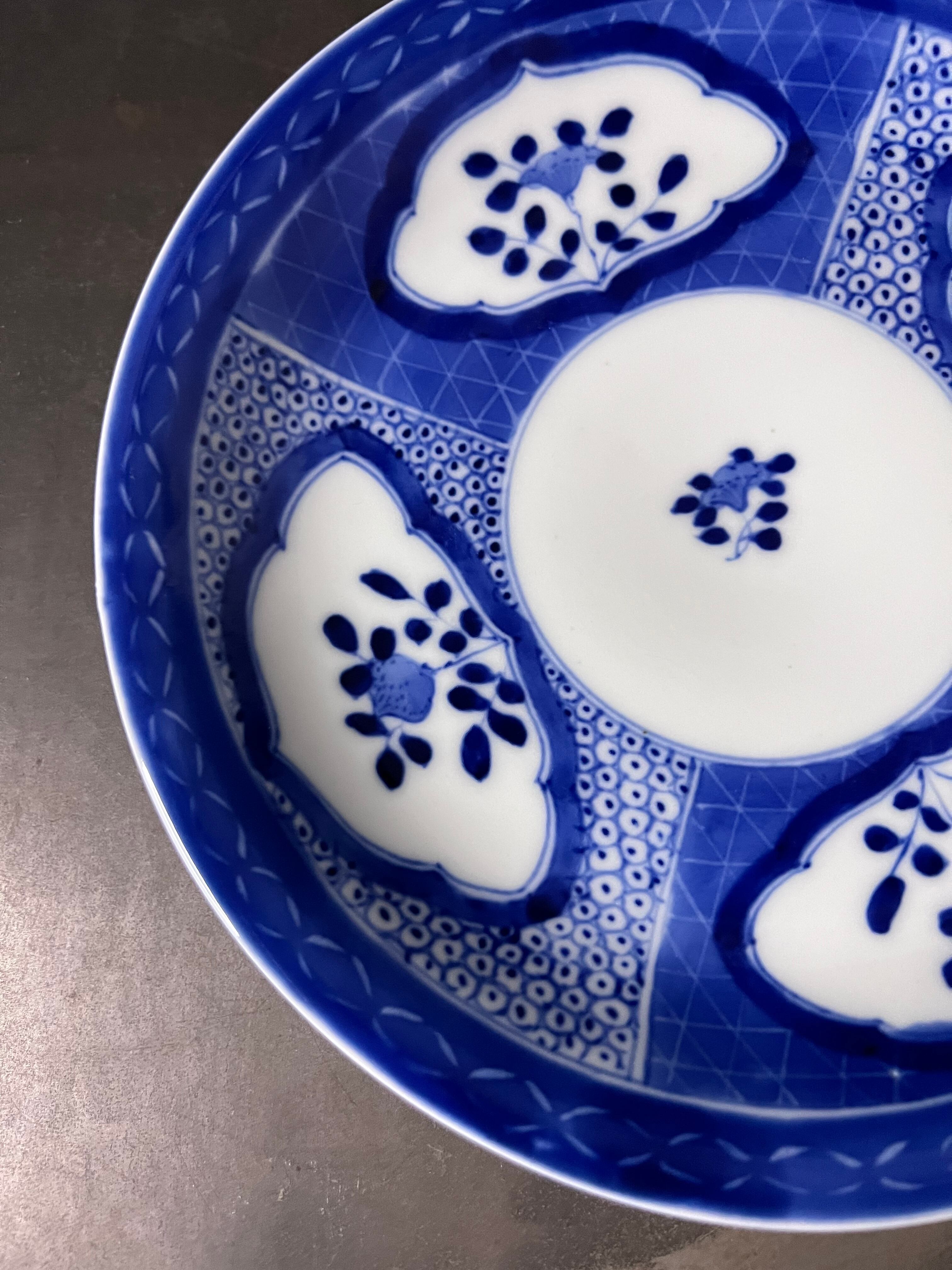 窓絵のなかに草花が描かれた、細かな絵付けが美しい染付中皿です。