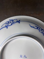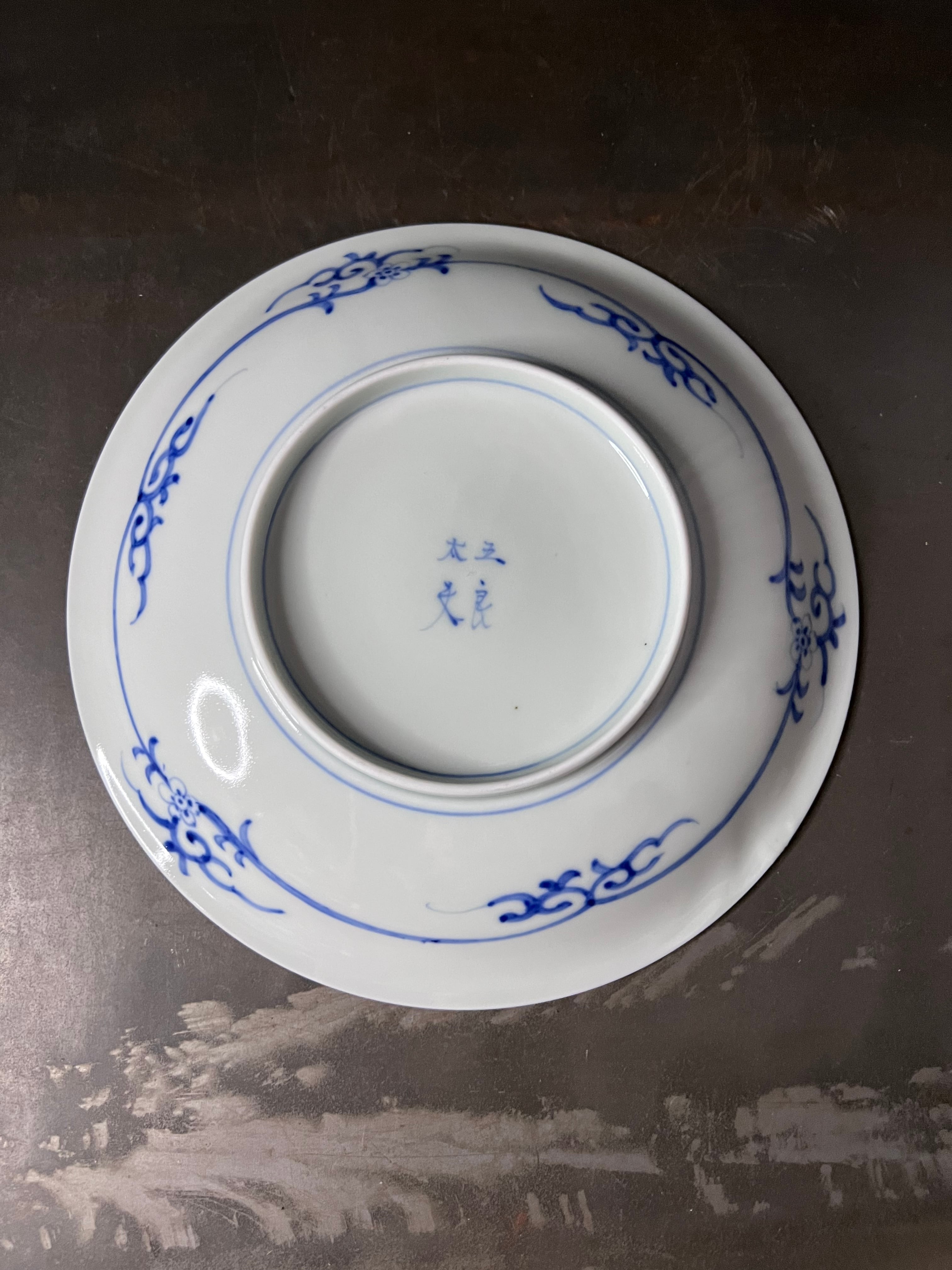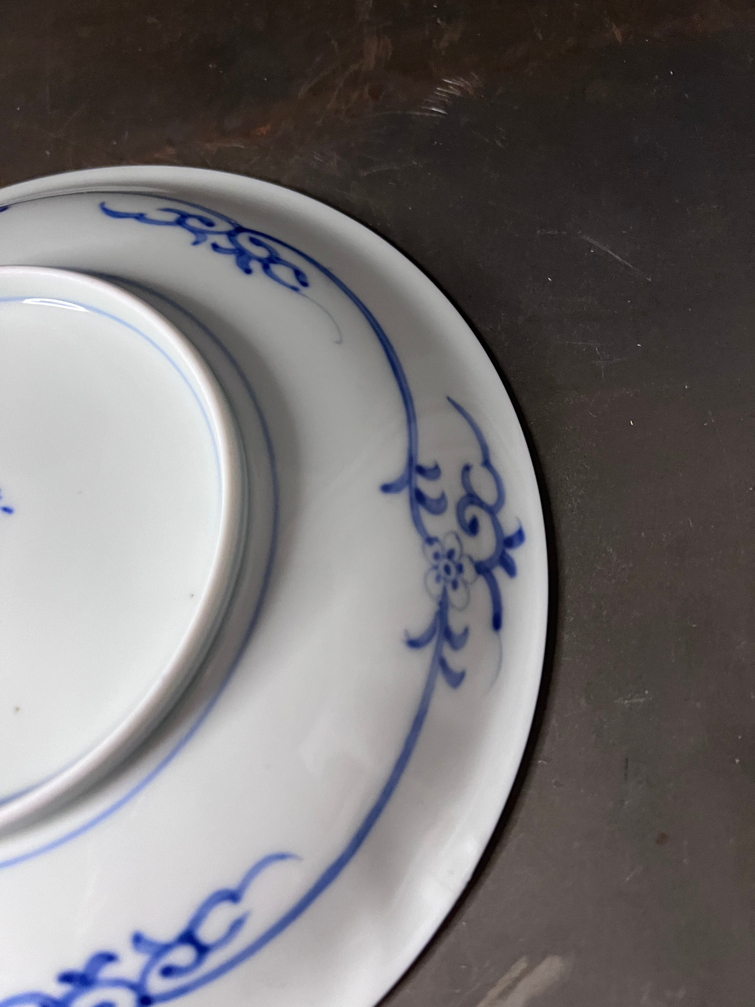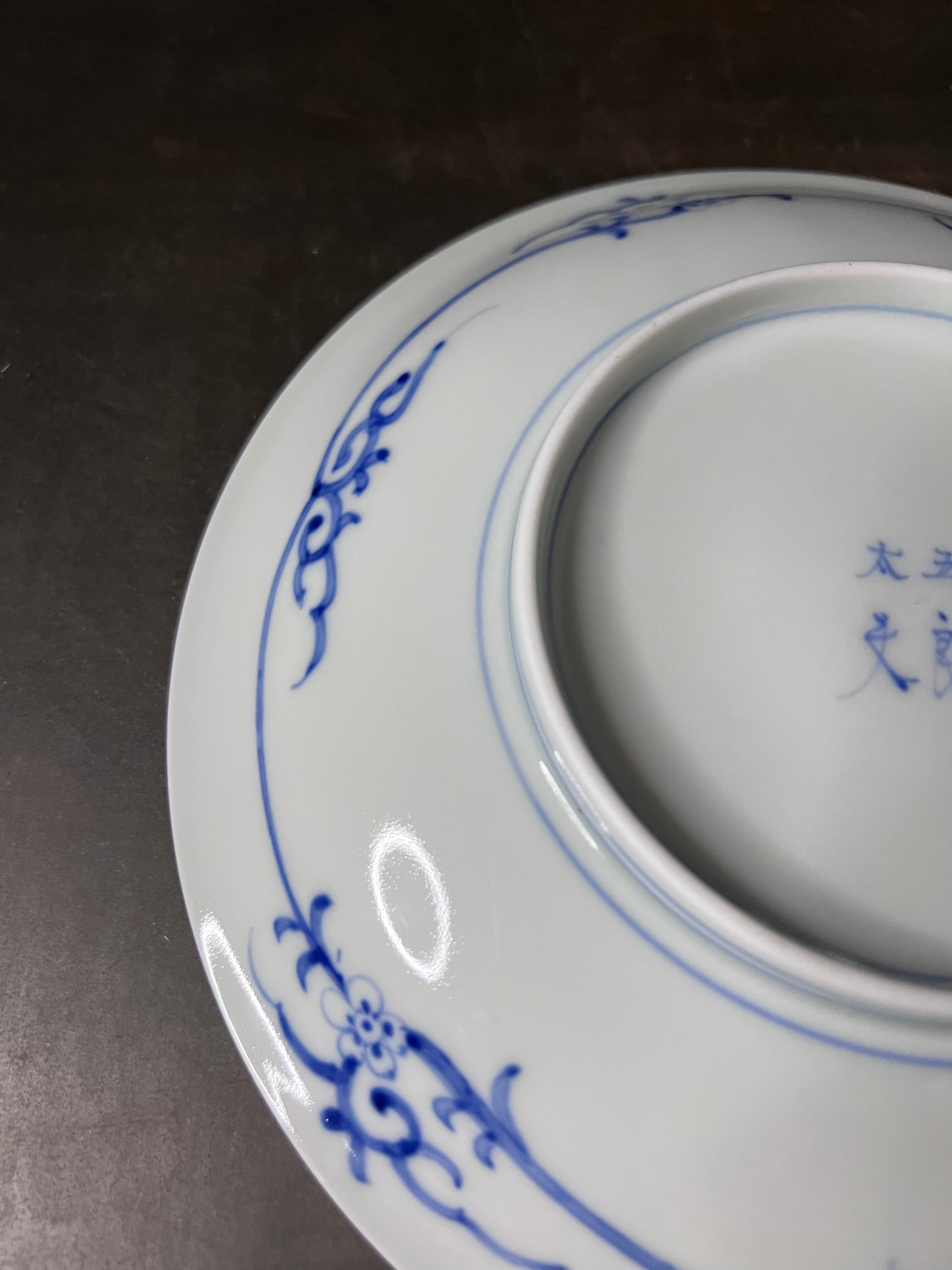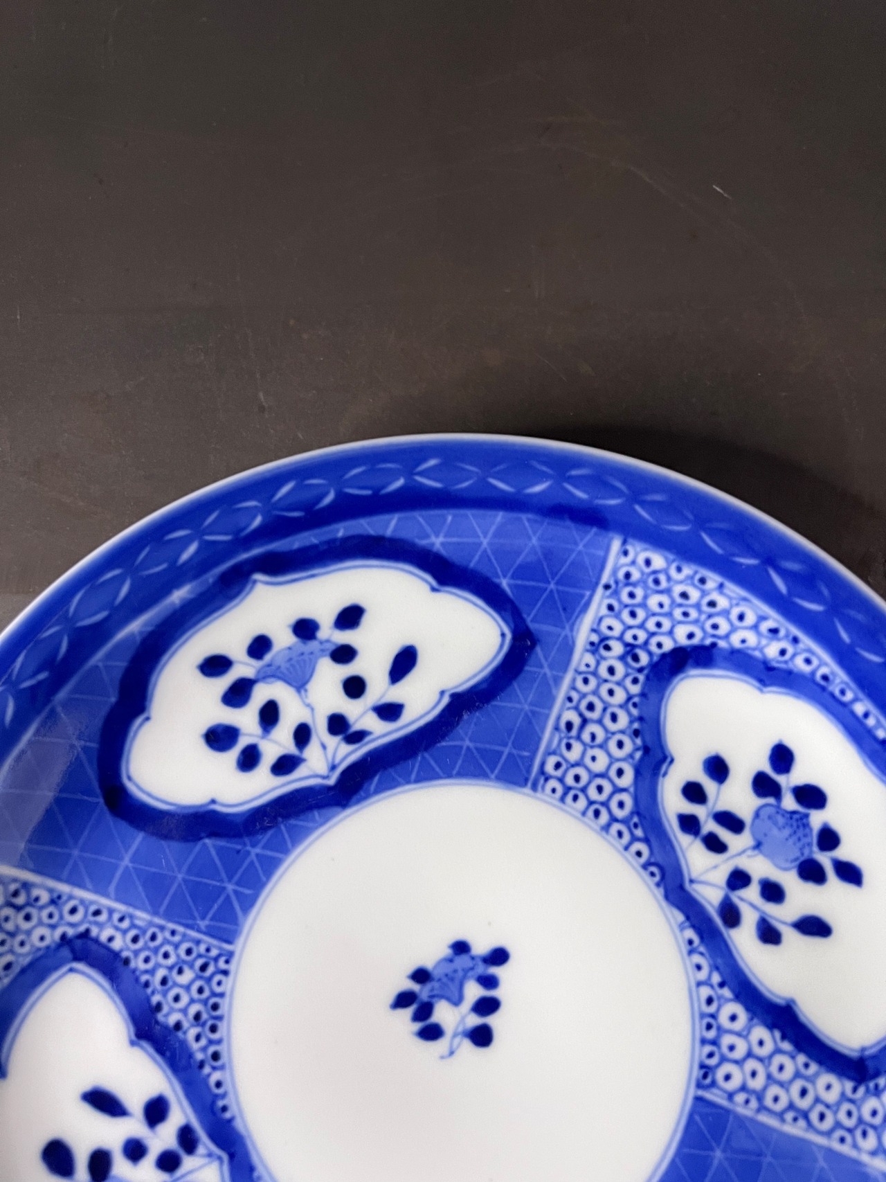 窓絵のなかに草花が描かれた、細かな絵付けが美しい染付中皿です。
