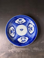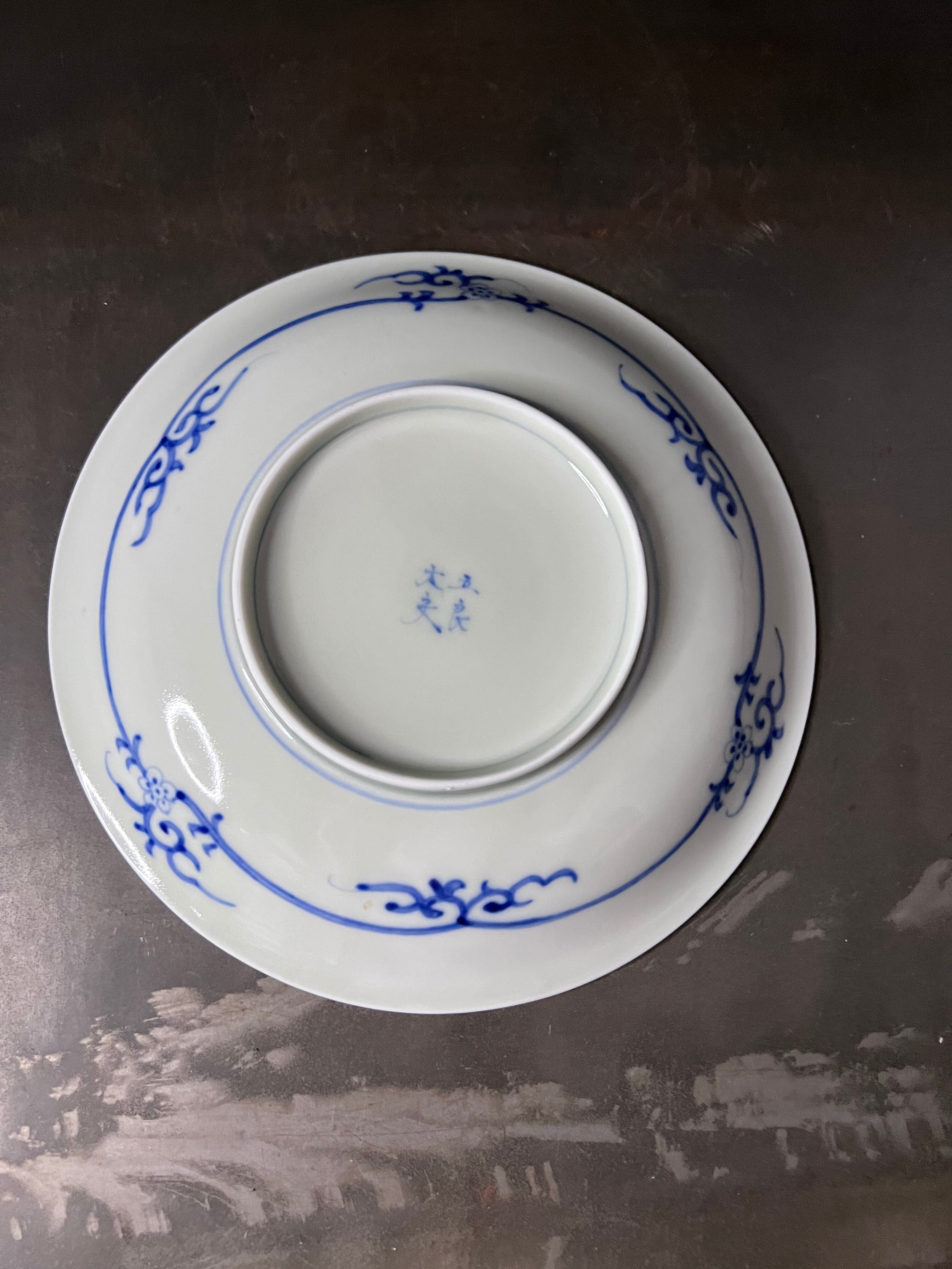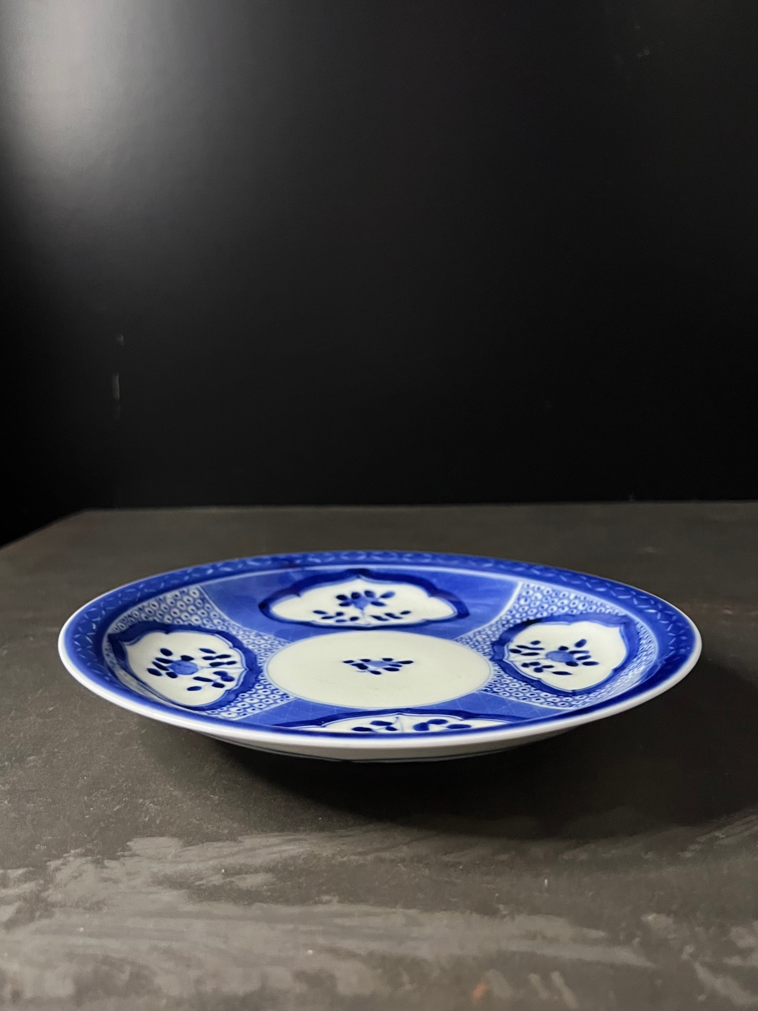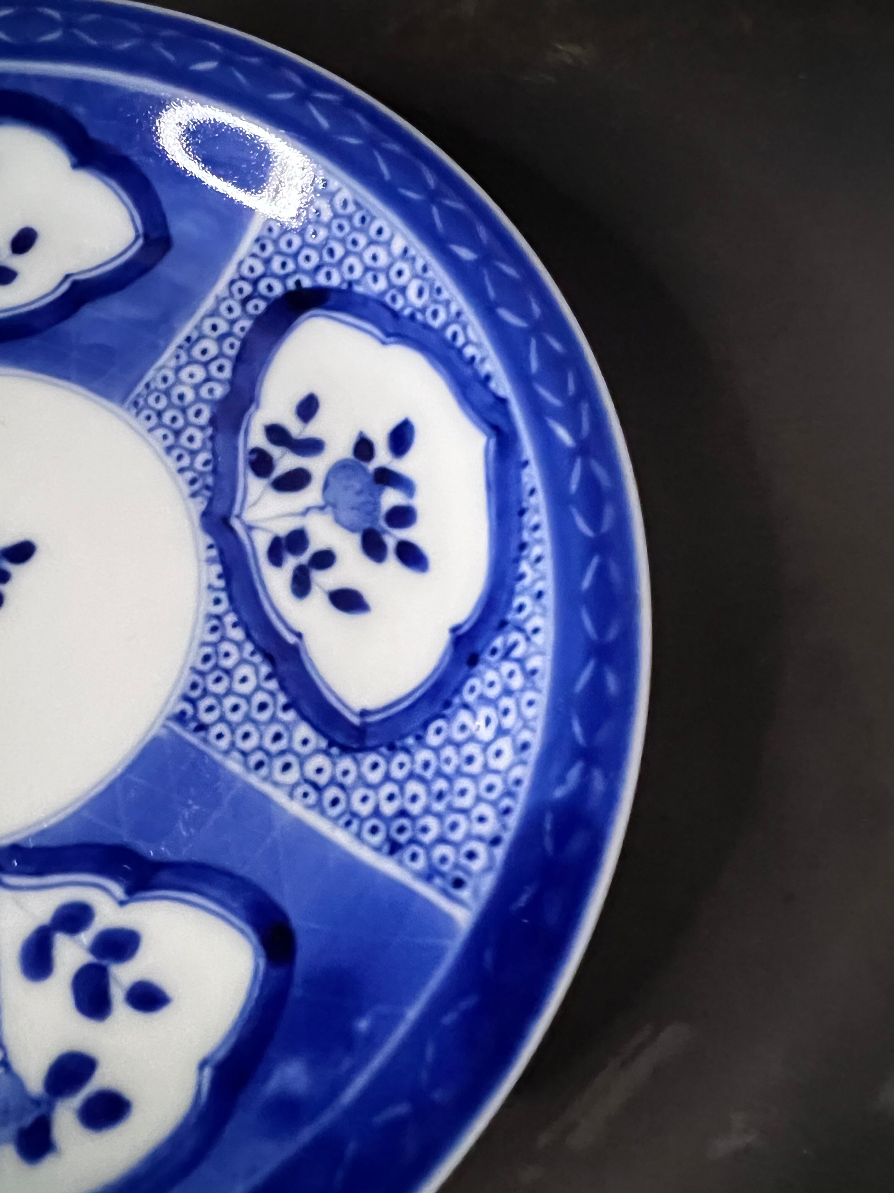 窓絵のなかに草花が描かれた、細かな絵付けが美しい染付中皿です。