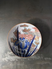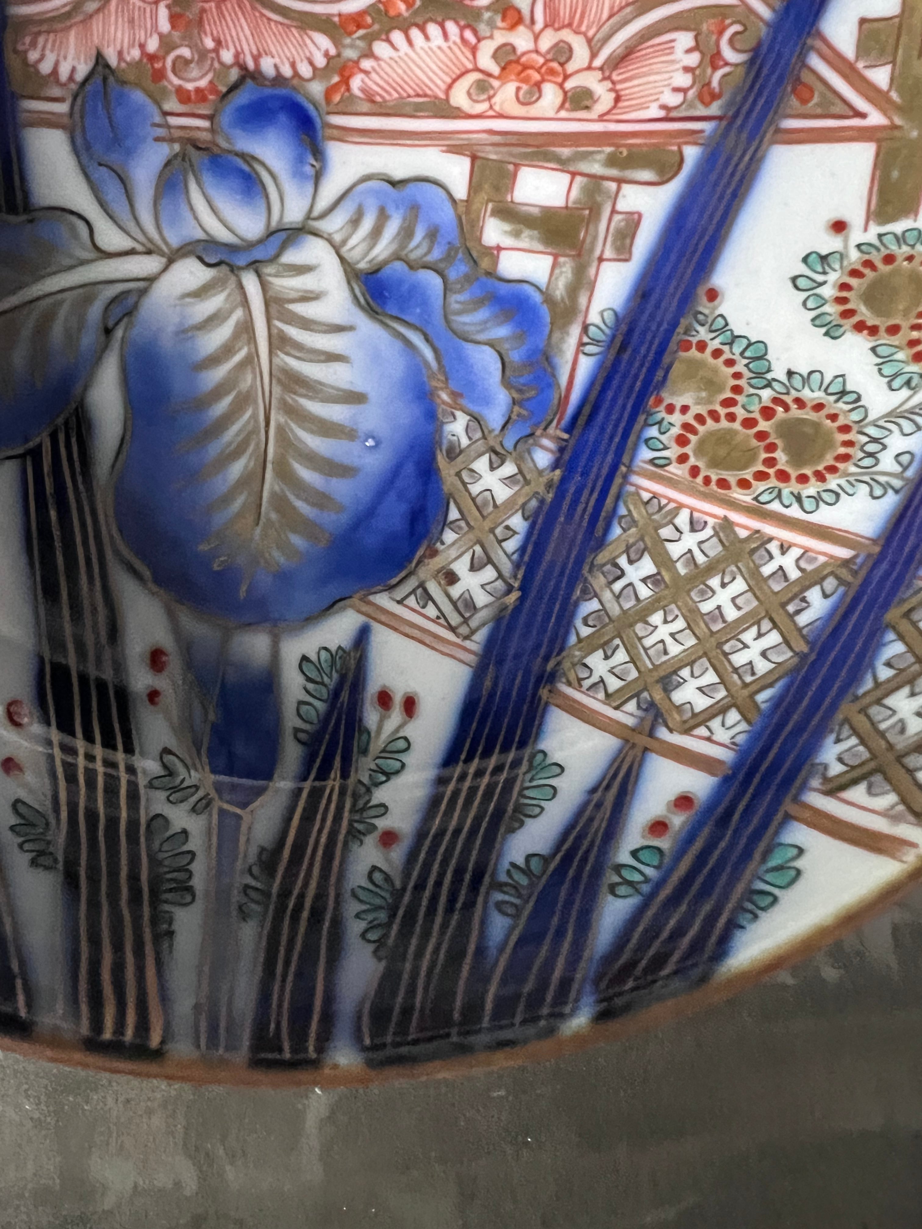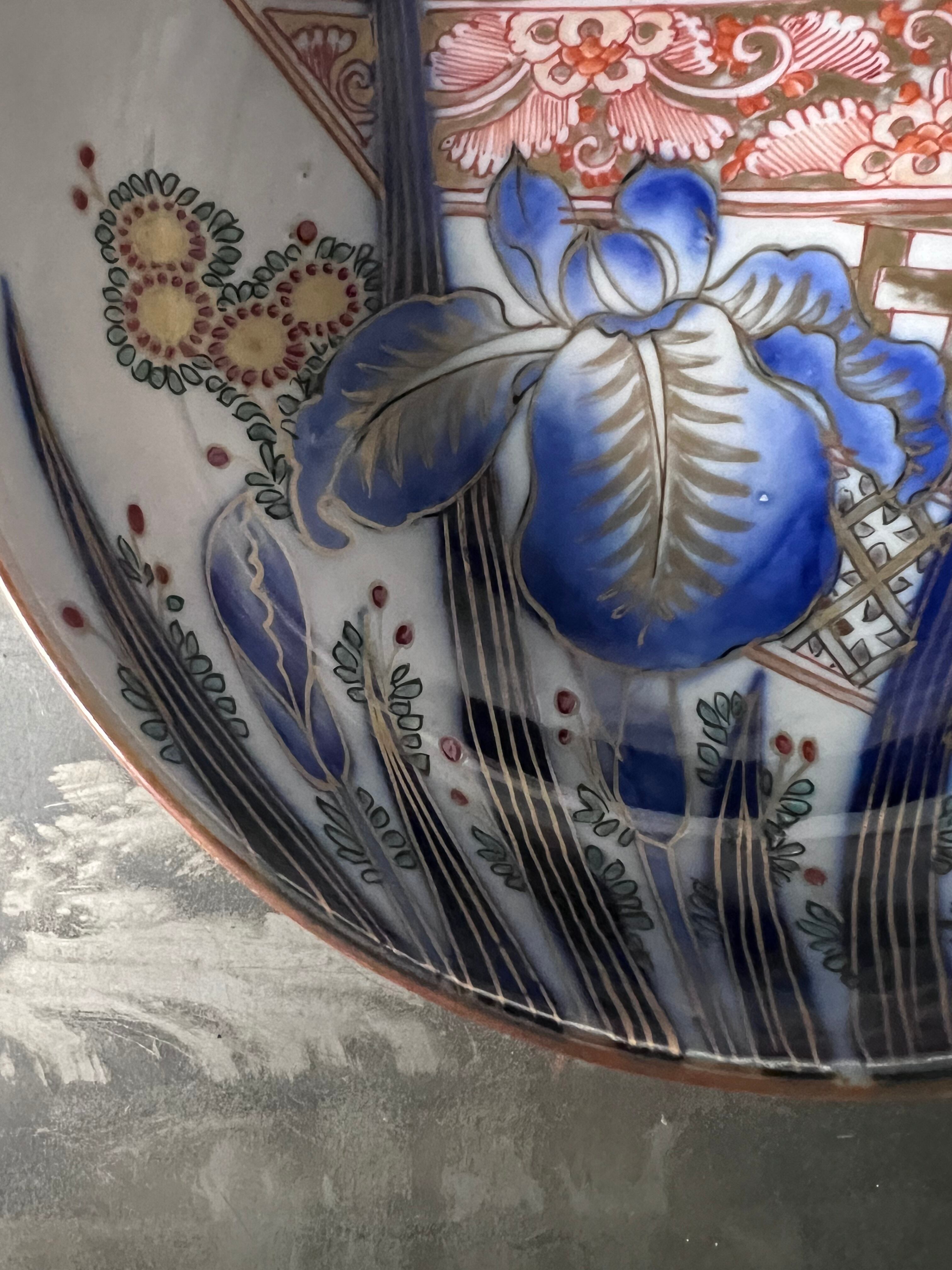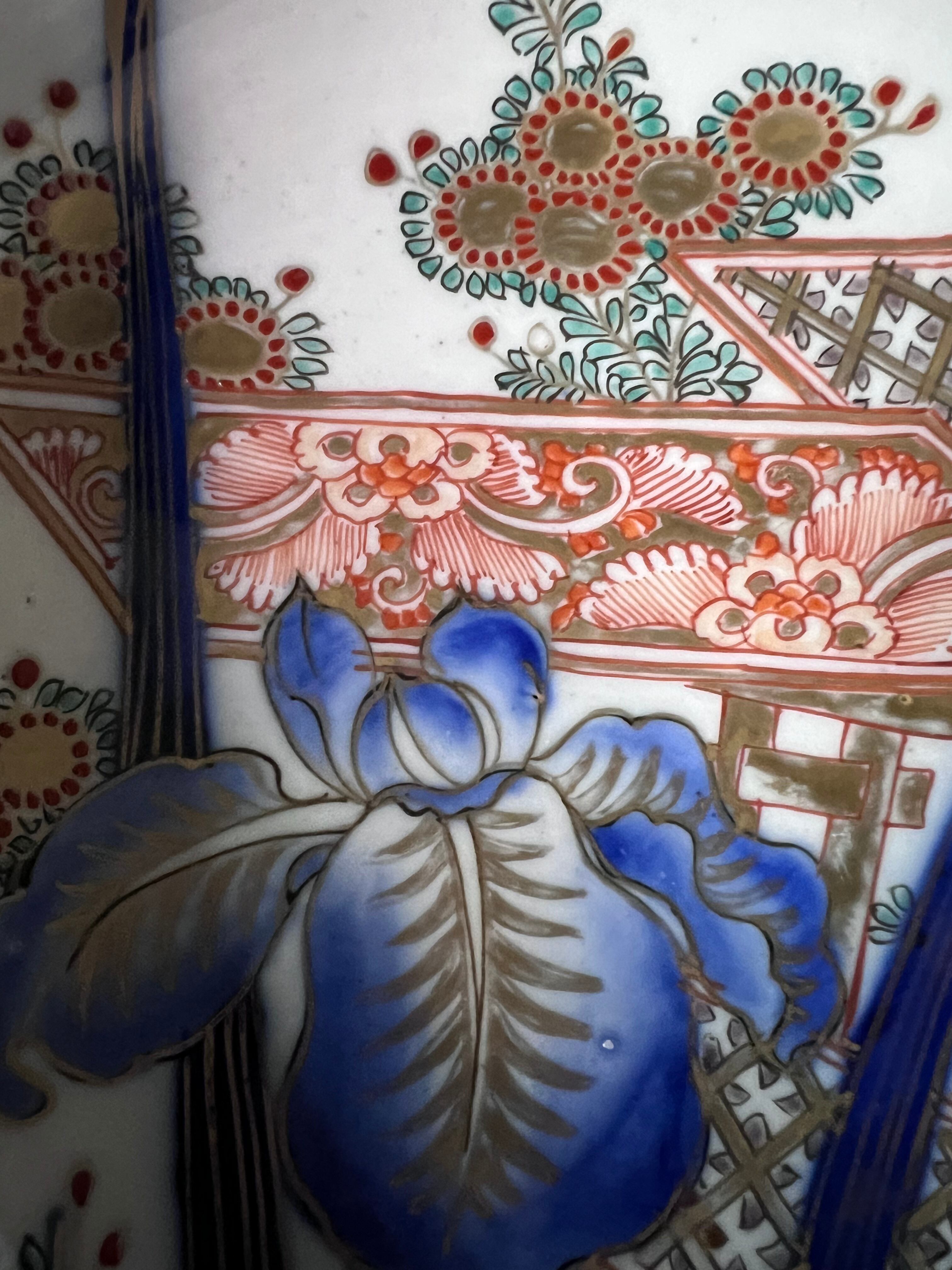 存在感のある菖蒲に細かく丁寧に描かれ草花文が可愛い、状態の良い美しいお品です。